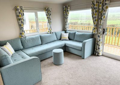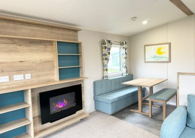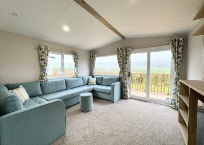 Lounge – modern wrap around seating, including a sofa bed, wall mounted fire with surround, fitted entertainment unit & patio doors.