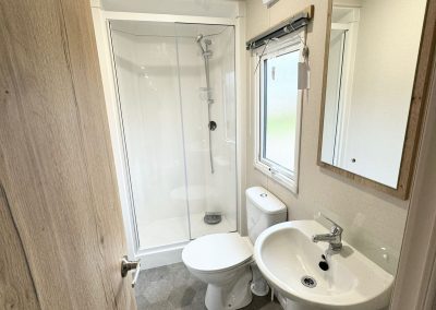 Bathroom – a large shower enclosure, w.c, wash basin & mirror.