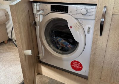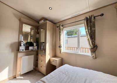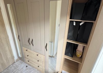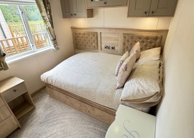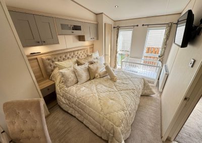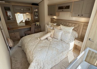 Inside, you’ll find a luxurious master bedroom with king-size bed, fitted wardrobes, and a private dressing area, plus a stylish second double bedroom. The modern bathroom features a full-size bath with overhead shower, vanity unit, and heated towel rail.