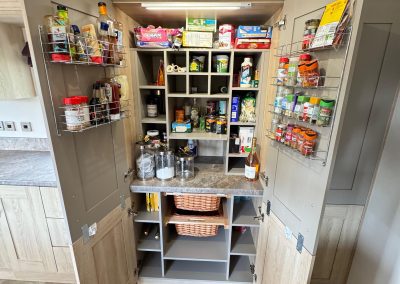 The fully equipped kitchen includes a double oven, gas hob, integrated washer/dryer, and a large larder cupboard with built-in storage. The open-plan living area offers two plush sofas, a feature fireplace, freestanding dining furniture, and French doors leading out to a private wraparound deck with countryside views.