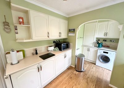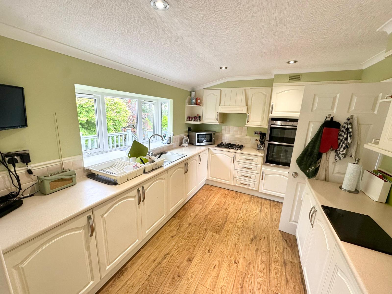 Inside, the lodge offers a bright and airy open plan layout with a real sense of space throughout. The dining area and kitchen feature tiled flooring and a range of integrated appliances including an oven, microwave, fridge freezer and dishwasher, along with ample storage. A separate utility room provides additional cupboards, is plumbed for a washing machine, and houses a boiler that was replaced by British Gas in 2025.