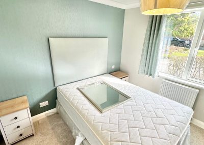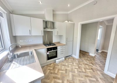 The kitchen is fully integrated with modern appliances, stylish panel flooring, and plenty of workspace. There are two bathrooms – one ensuite with a shower and another with a full-sized bath, ideal for guests or family.
